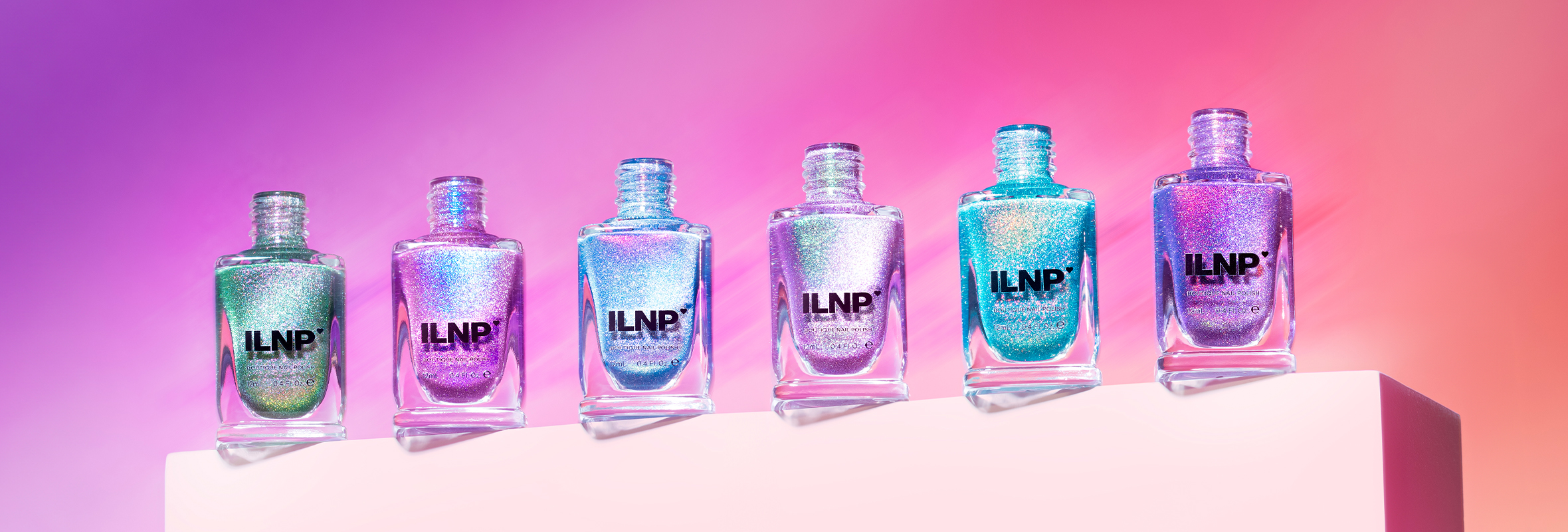 Light up the night with Glowstick, a radiant pink holographic with silver magnetic sparkle, blending within the pink-tinged base to take on a peachy hue.