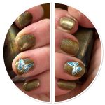 Absolutely stunning greenish gold with blazing linear holo. Very beautiful. Still trying to decide if it suits my skin tone.