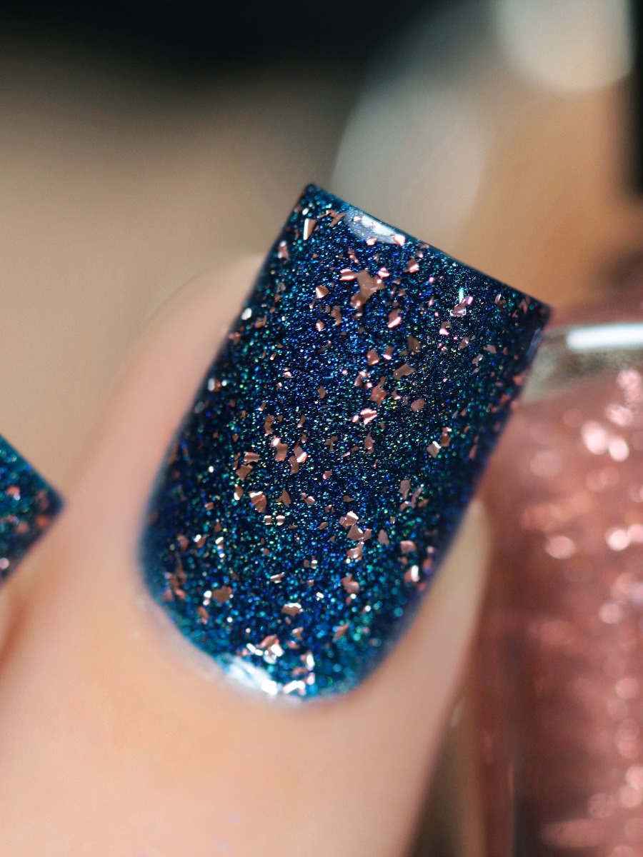 Showcasing a significant ratio of holographic micro-flakes, Vanity is balanced with a captivating assortment of vivid copper micro-flakes.