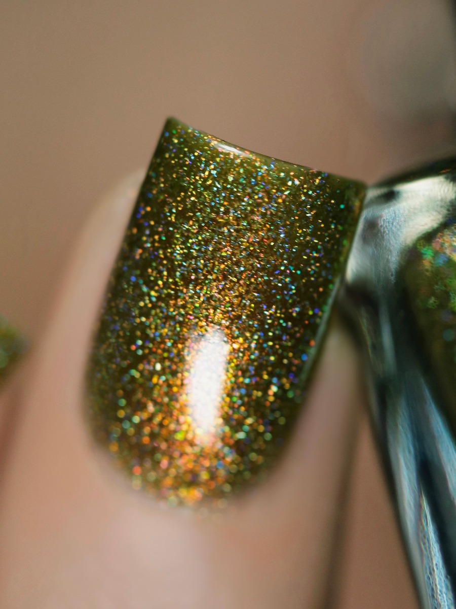 Legacy is a distinctive olive-yellow based shimmer holographic.