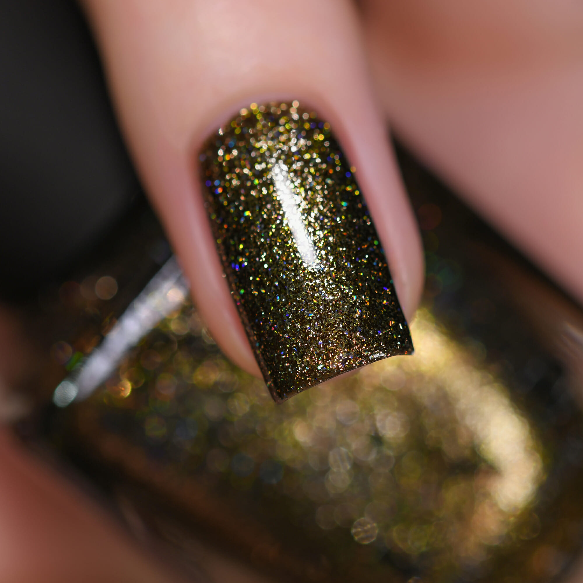 Laced with an assortment of metallic gold sparkles and unique array of holographic pigments, Caesar will have you mesmerized while wearing it. In certain lighting conditions you may even notice Caesar displaying a subtle color shift that transitions from a beautifully rich olive green to a mesmerizing gold.