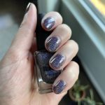 a unique smoky grurple (grey-purple) perfect for the colder months. I love the pairing of the grungy color with the fun rainbow sparkles. the packed holo catches direct light beautifully but is visible even in lower indirect light (both pictured). opaque in 2 coats.