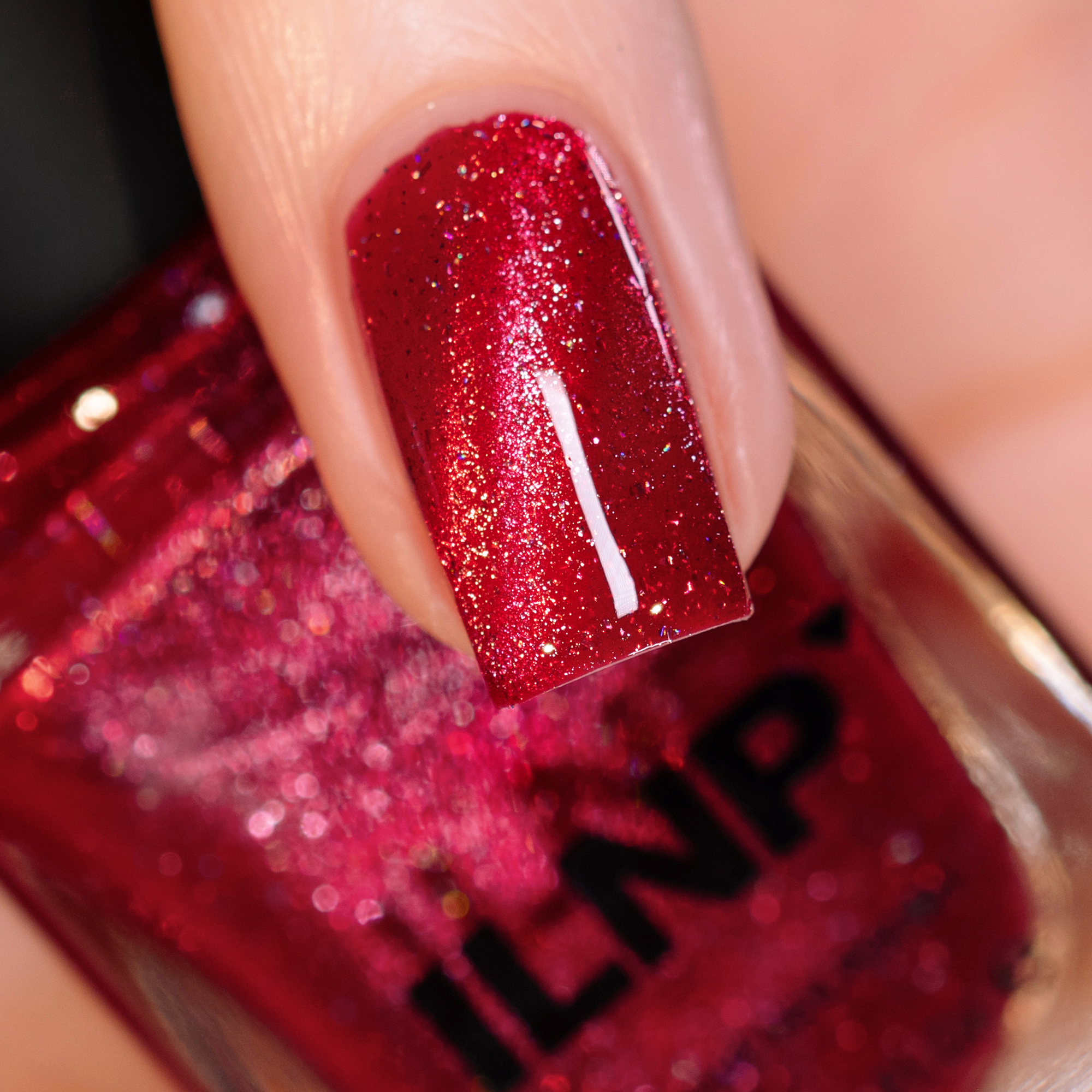 Vivid red surges with juicy intensity as holographic sparkle and scattered reflective silver flakes flicker beneath the surface. A luminous magnetic shimmer pulls sharply through the base, forming bright cherry-red flashes that cut across the red hue with a glowing, dimensional contrast. Shirley feels bold, sweet, and instantly captivating.