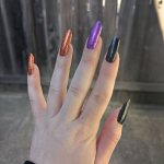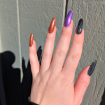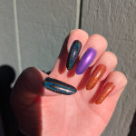 I bought this polish for Halloween but it would work great as a summer shade too. This is the only orange in my collection, but I love it! The larger glitter flakes make it sparkly and fun. Ring & pinky: ILNP Trick Or Treat, middle: Orly Alexandrite By You, pointer & middle: ILNP Black Magic